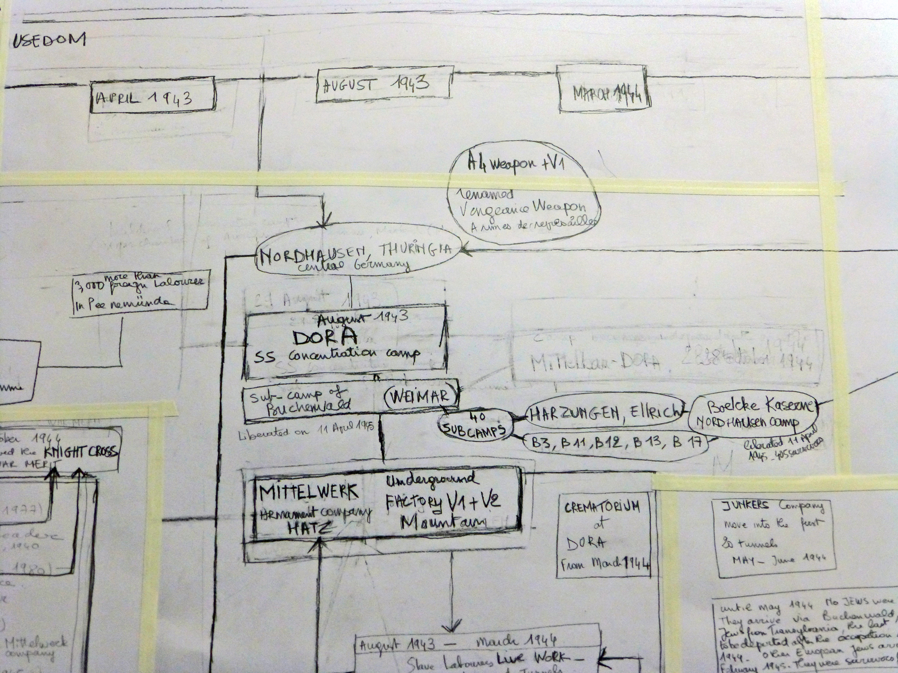 Faced with the tangled and complex stories linked to the V2, multiple narratives that take us across continents through time and space, Dupré worked on a 4 meter wide and 2 meter high wall timeline. Timeline draws out, methodically and obsessively, multiple and detailed connections that link together nations as well as individuals whose lives were dramatically changed by choice or force through major WW2 and post-war events.