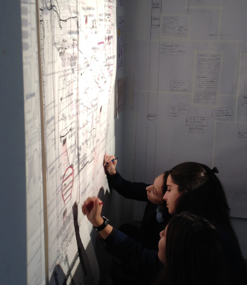 The project introduced students to the artists’ personal family histories, archival and historical research including V2 technical drawings and contemporary artwork relevant to the project’s theme. Students used drawing and collage to create a temporary collaborative wall installation that was then filmed by students.